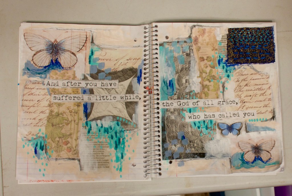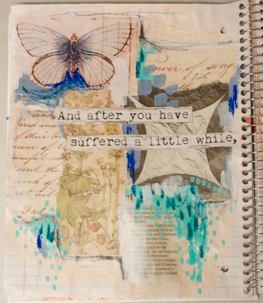 I love how this spread looks so unexpectedly different from the first one. I was envisioning this entire journal being varying hues of pinks and reds and corals because of the colour palette, but soon realized that it doesn’t have to be. After laying out the elements for this spread, I was drawn to the blue of the butterfly and thought I would mix an aqua colour to go with. I mixed too much and wondered what to do with the rest. That led to wondering if I could somehow make blue with aqua and magenta. It turned into a periwinkle purpley blue, which I was quite happy with. When looking for words to go on the page, I found a sheet that had 1 Peter 5:10 on it and felt like it went with the journal so far. The first spread has “my defender” and “He arms me with strength for battle.” All of these themes felt appropriate to the time we are living in. We are in a battle now more than ever, and need to rely on God, our defender. I love that the Peter verse talks about how after we have suffered a little while (and haven’t we.. I feel like the whole world has a bit of trauma at this point), that God will HIMSELF restore, confirm, strengthen, and establish you.. oh what a promise!