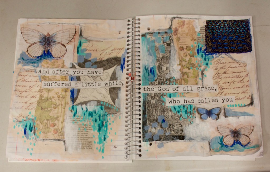This is the second spread I made in my journal. I’m not committing to an everyday art practice, even though I generally try to come downstairs to my art desk every day at least once for a few minutes to do something creative. With a busy home life, that quiet time can be a sanctuary for me.