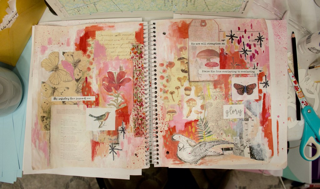 The above photo is a bit of a spoiler alert for an upcoming journal spread I will be sharing, but I just feel like every art blog post needs to start with colour! So there you go. I am absolutely in love with how these two pages turned out, they make me so happy every time I see them. Which leads me into today’s topic: motivation. Why art journal? What I was just discussing is a big reason that I have fallen so in love so quickly with art journaling. When I am painting on a canvas, often my vision is not executed the way I originally planned. And that almost always bothers me. But with art journalling, it doesn’t. I didn’t really have a plan when I started the above spread, but whatever idea I may have had, this was not it. Yet, that doesn’t bother me. I’m not sure if it’s the cheap paper I’m working on, and the fact that it doesn’t need to be “permanent” (archival, etc.) or the fact that I’m not making this journal for any specific purpose other than to try art journaling. But whatever the case may be, I find it very freeing.