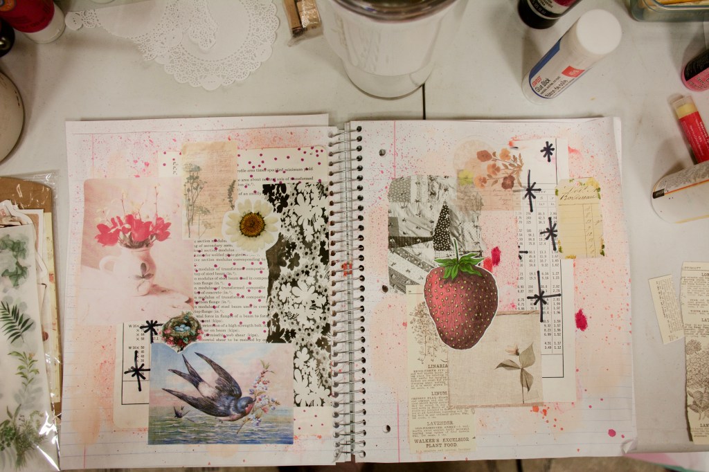 I think the main highlight of this spread is that there is really no central theme, other than maybe nature. But I think that’s what I love about it. I really love the black and white bold floral pattern near the center. I also love the crazy excess of spray ink, bottom right.