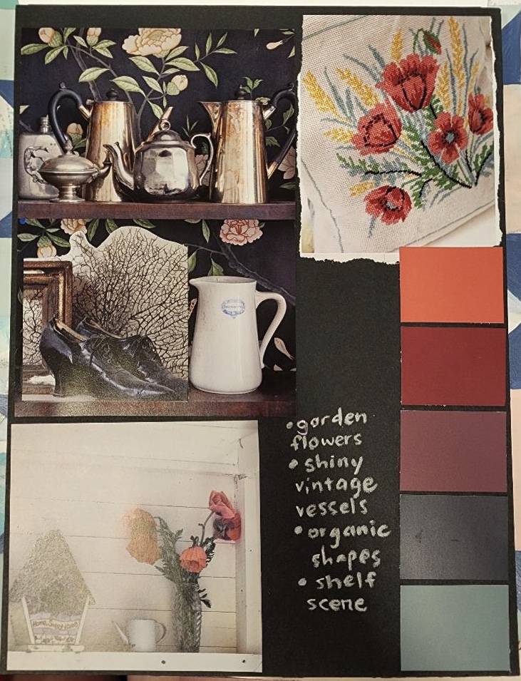 First, I flipped through some interior decorating/design magazines and books that I had found at the thrift store. I tore out some images that seemed connected in some way, and that were exciting or beautiful to me (or both). I arranged them in a pleasing way, and then went through my stash of paint swatches and chose a colour palette inspired by the images. Finally, I wrote some notes that were either things that were common to all the images, things that stood out to me, things I like, and things I may want to incorporate in future artworks.