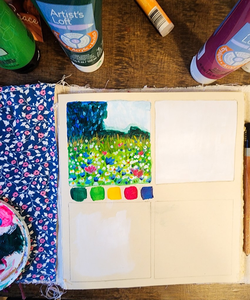 I’m signed up for Kellee Wynne’s {Color for Your Inbox} and her recent email was all about using grids in your journals. She had so many lovely grids on a little preview video in the email, and so of course I was inspired and wanted to try. I decided that one of my hand made journals would be perfect for the task, as the pages are cardstock and hold up fairly well to the paint. I have been wanting to become a more proficient landscape painter and develop my style in that genre and so I thought a grid journal would be a perfect place to practice. These are approximately 3 inch squares and I will be able to fit so many paintings into this journal, which means loads of practice.
