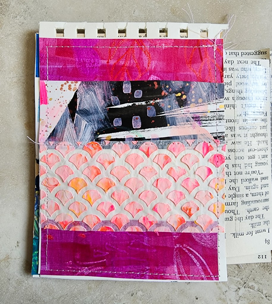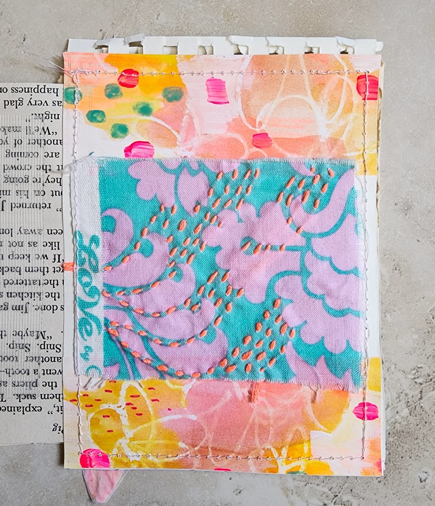 Below is my art journal submission for the week. I really love all the pink. Pink and coral get me. I grew up pretending I didn’t love pink so much, because I’m a middle child of brothers. But I just love pink. I also love the embroidery. I need to get back to doing some more embroidered patches to add in to my journals. While I don’t always love doing a full blown embroidery piece, doing little patches is a very accessible way to enjoy some stitching. I’d love to know what projects you are working on this summer, feel free to drop a note in the comment section below.