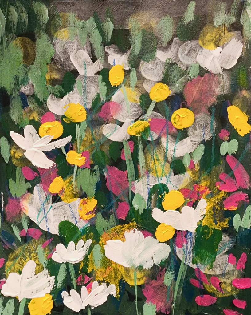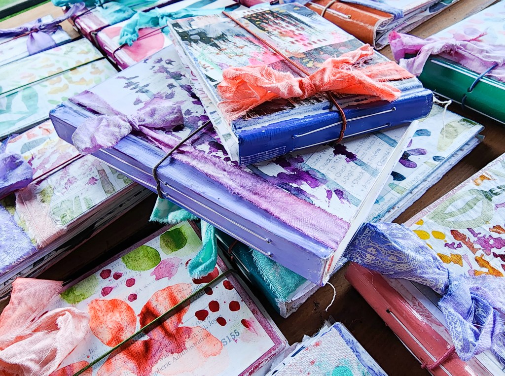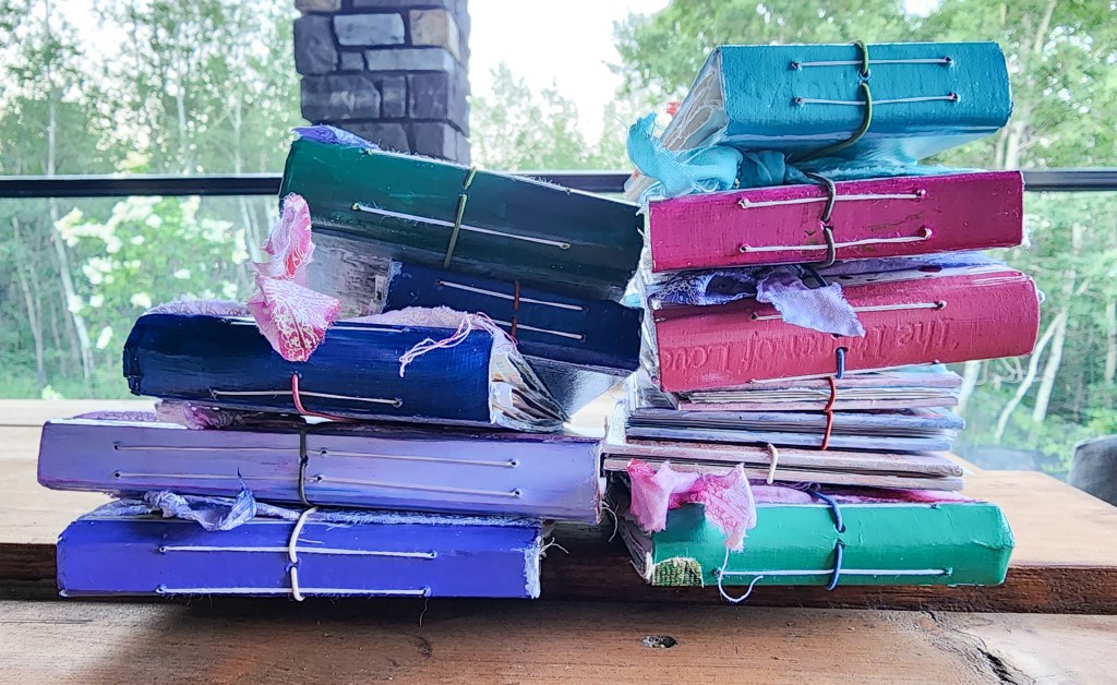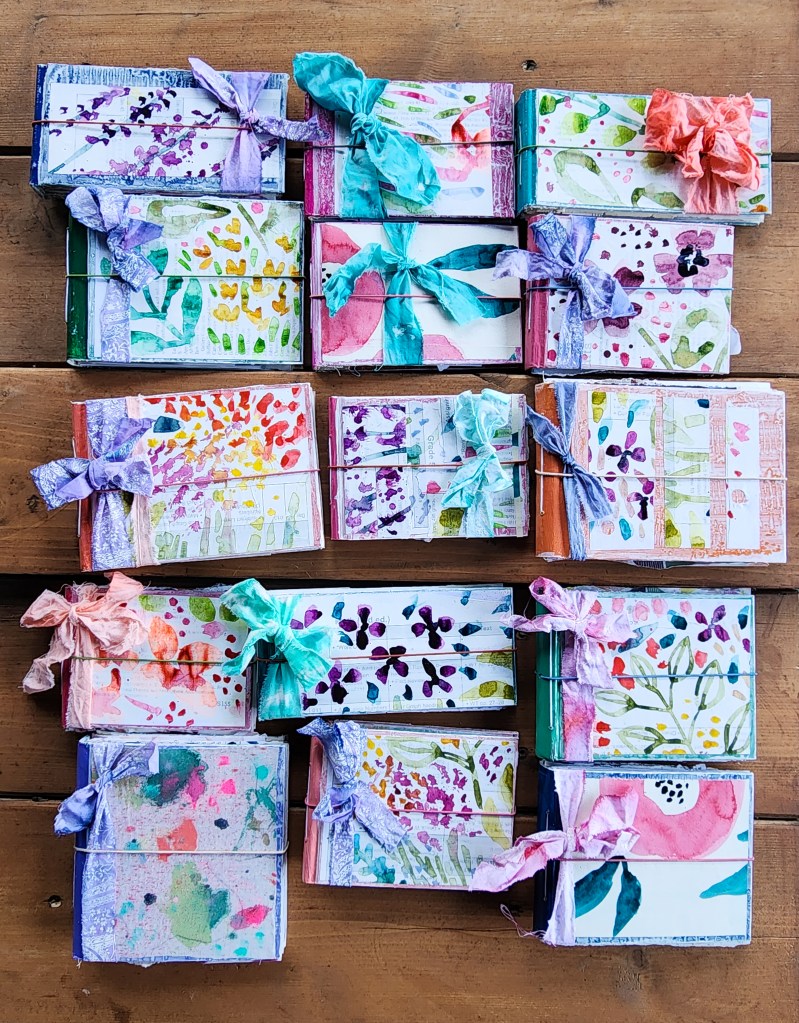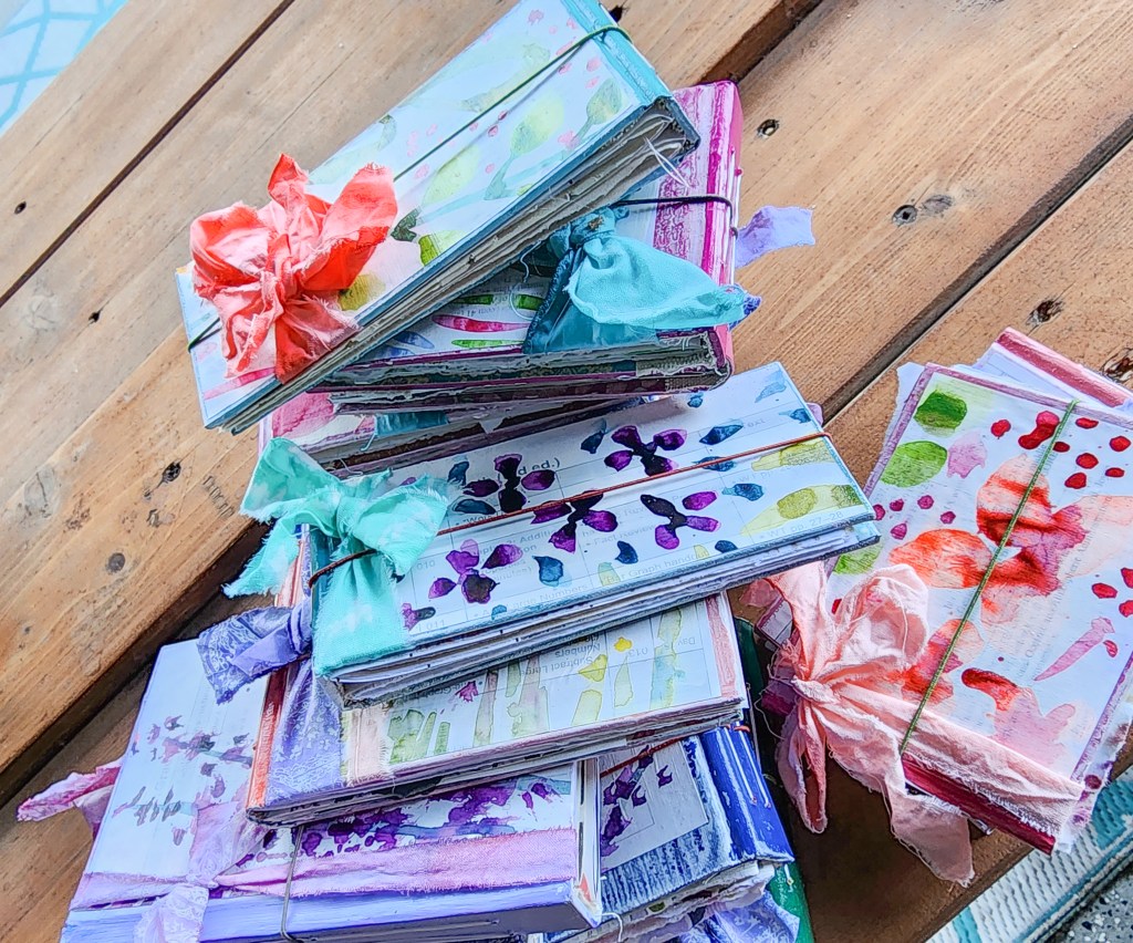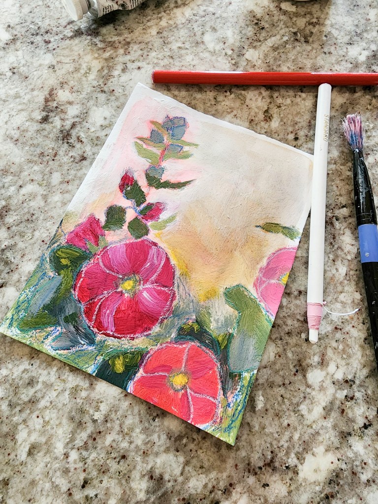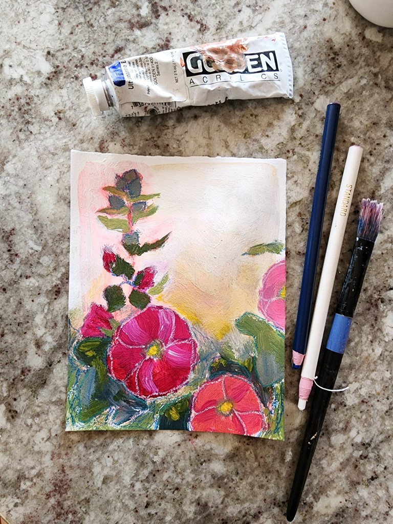 This week I was able to finish up my mini journals, which I was pretty pleased about. In my artistic venturings over the years, I haven’t always been the best at finishing every project I started. I have determined to change that. I had watched a free art video the other week and learned how to create your own hand-dyed ribbons, and I couldn’t resist but add those to the journals as well. They are just made with some old off-white fabric that I had, which I tore into different sized strips and then dyed with watered down India ink. I also included some photos of the paintings I did as part of my mentorship course. I had been struggling with not loving what I was making, and after doing a lot of studying of art that I love, I realized that I needed to loosen up my work. So the three paintings above are my beginning attempts at loosening up. I really love the hollyhock one and want to continue in that direction.