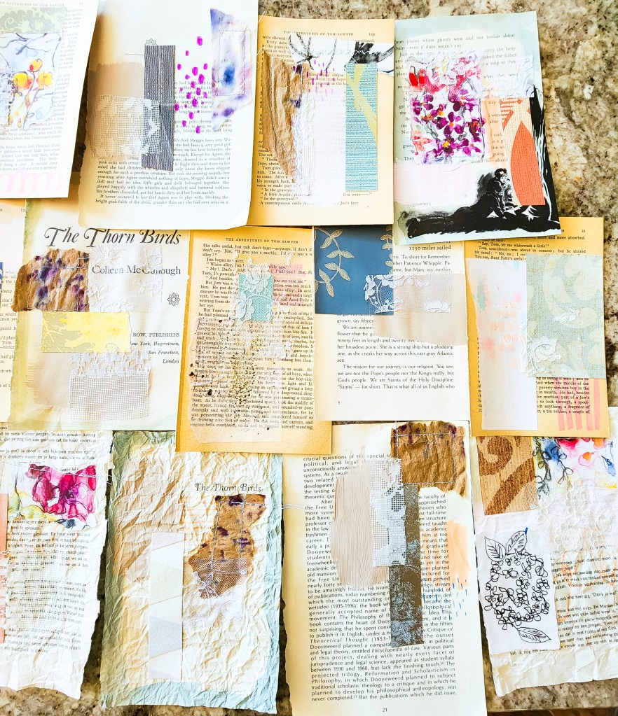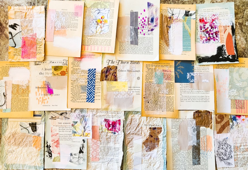 I have sadly not been painting much lately, even though I am just working through the last module of my mentorship program and am supposed to be working on making some masterpieces. It has been a really good experience though and I feel like I have a lot more direction going forward. I will probably have to rewatch all the videos at some point. I have been working on lots of parts and pieces in the meantime though. I’m working on some tiny embroidery squares for collage, and I finally got my hands on some wallpaper sample books (woohoo! been trying to find some for years), and so I’m planning to do some cutting tonight and work on some Matisse-esque collages. Speaking of collage, since I have been repurposing so many old books into journals, I have an abundance of old book signatures sitting around, so I have been working on a huge series of old book page collages. They have been so fun to do, and I’m thinking I may offer some of them for sale in my etsy shop when they are finished.