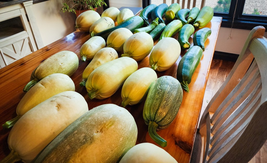 The first thing to share is a garden update. The last two summers I didn’t plant a garden because we have clay soil here and I wasn’t having great success with it. We did a big yard reno last summer/fall when we were getting our house ready to list, so my husband built 6 big raised beds and we installed them in the garden area with some landscaping to finish it off. I decided to just let the kids take over the garden beds since I wasn’t sure when we would be moving (I figured we would have moved by now!), as I thought it would be a good learning experience for them. And wouldn’t you know, we had an absolute bumper crop this summer, so I am currently swimming in zucchini and squash. The last few days I made 2 zucchini loaves, 5 dozen zucchini muffins, and some beef zucchini soup. That used up about 3 zucchinis and I think I have around 20 left to use! So I’m going to have to get creative or be that lady trying to give zucchini to everyone.