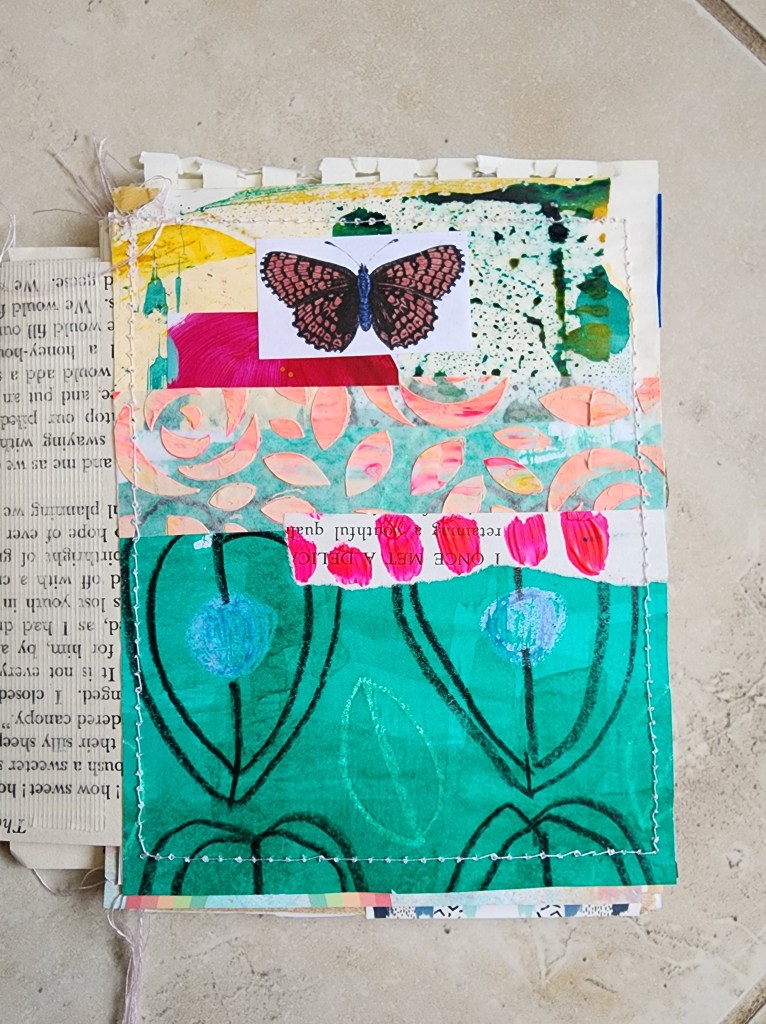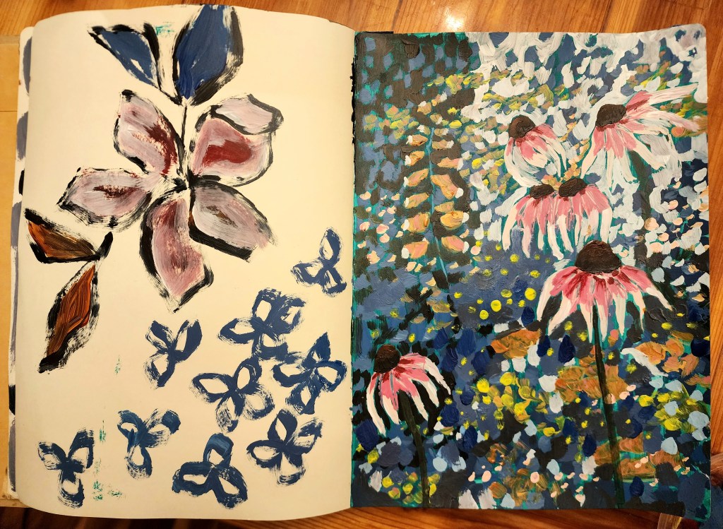 During this time of making time, I decided that I need to be intentional about painting. I have been putting it off because I was feeling so tired and unmotivated lately, but it really does a wonder for my well being. So I pulled out my big dylusions journal and painted the coneflower scene, and used my leftover paint to make the floral painting on the opposite page. I love them both. And it was so freeing to paint without any pressure, but with intention. My intentions are often related to painting wild garden scenes and loosening up. And I feel like I accomplished that.