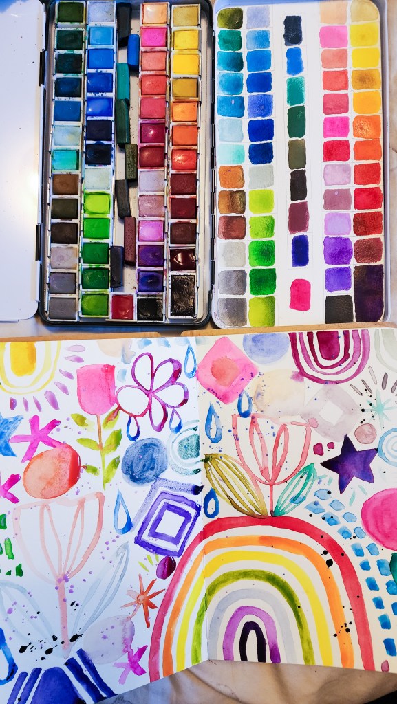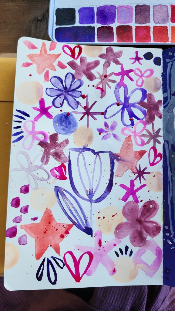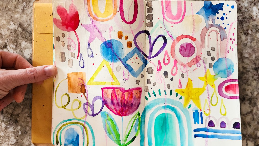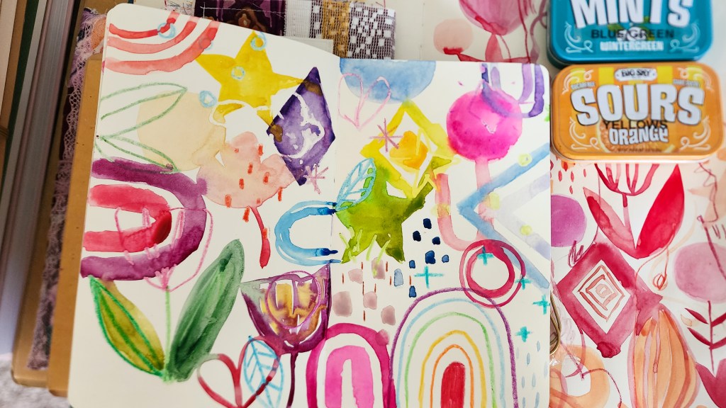 Recently I watched a Helen Wells class about finding your art style. She did a watercolor demo in her art journal, and I took the time to try it myself (which I often don’t) and I’m so glad I did! It’s become a new obsession, and I decided to dedicate a whole art journal to messy watercolor play. If you haven’t checked out her videos on youtube, I definitely recommend it!